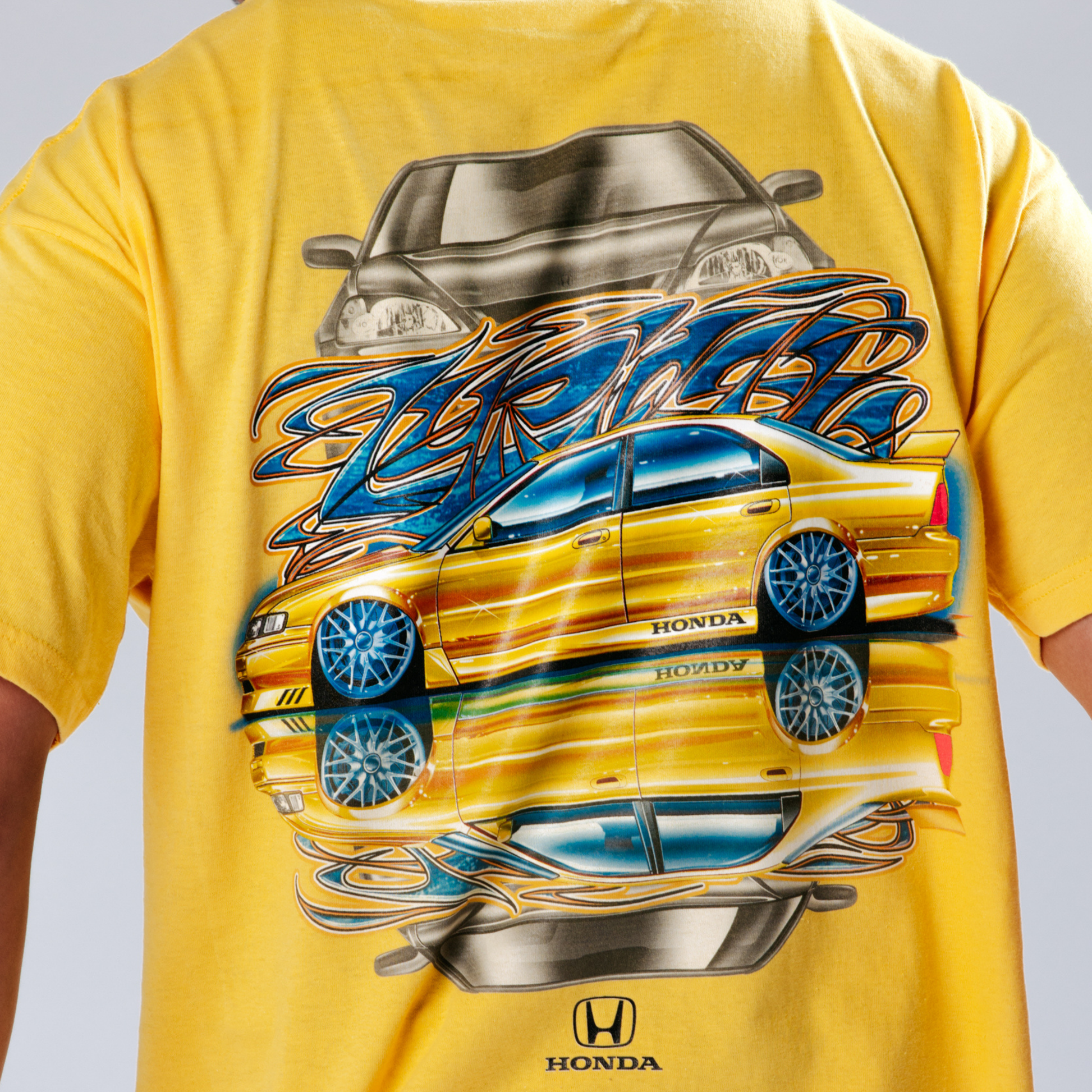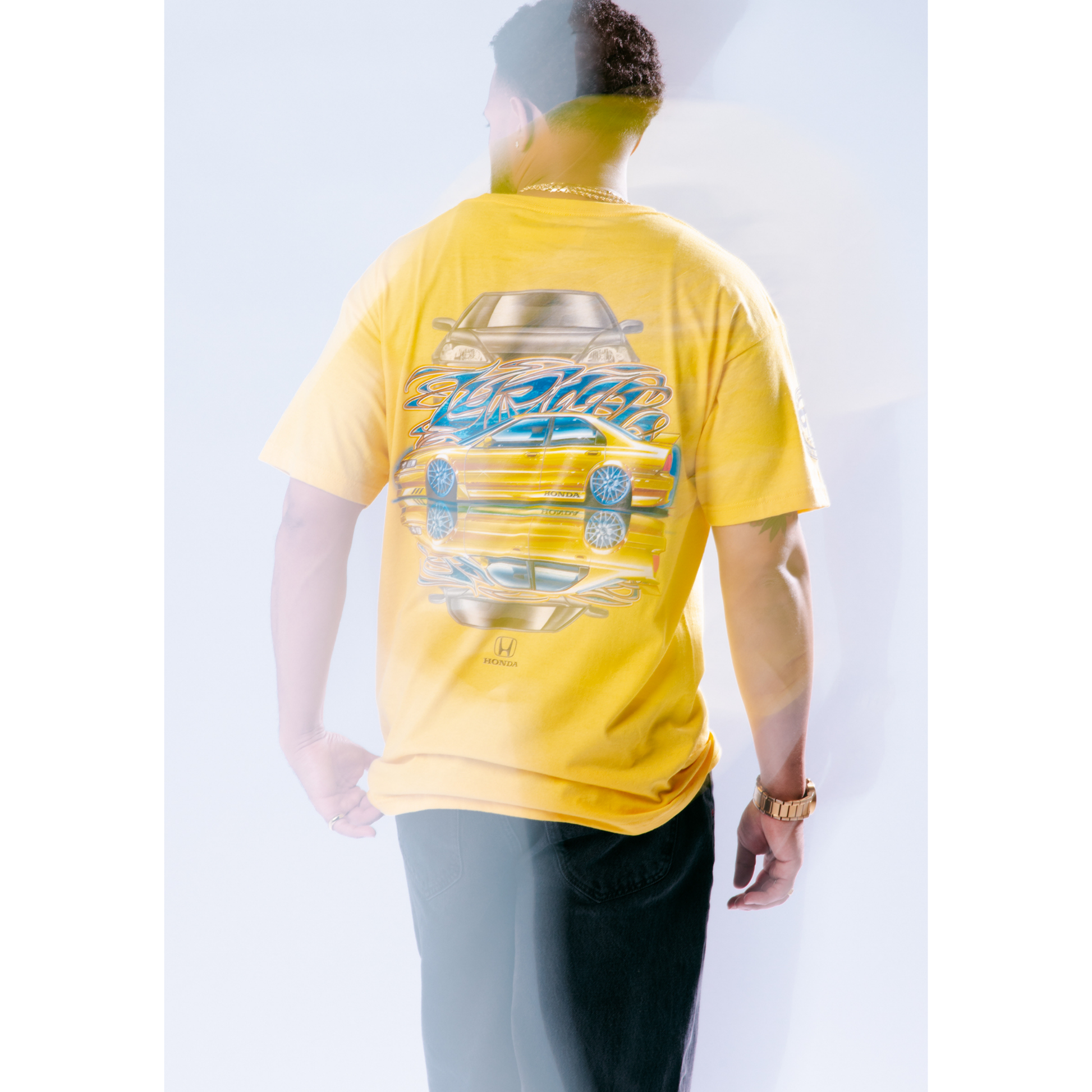 The Exhaust Lyrics tee pays tribute to one of the unsung heroes of the Golden Era: the Honda Accord. Inspired by the iconic yellow Neuspeed Touring Car, this design combines Dennis Caco’s automotive artwork with graffiti influences from the streets of San Diego in the 1990s. The graffiti “Lyrics” across the back celebrates the symphony of a high-revving Honda engine and the unmistakable sound of VTEC crossover.