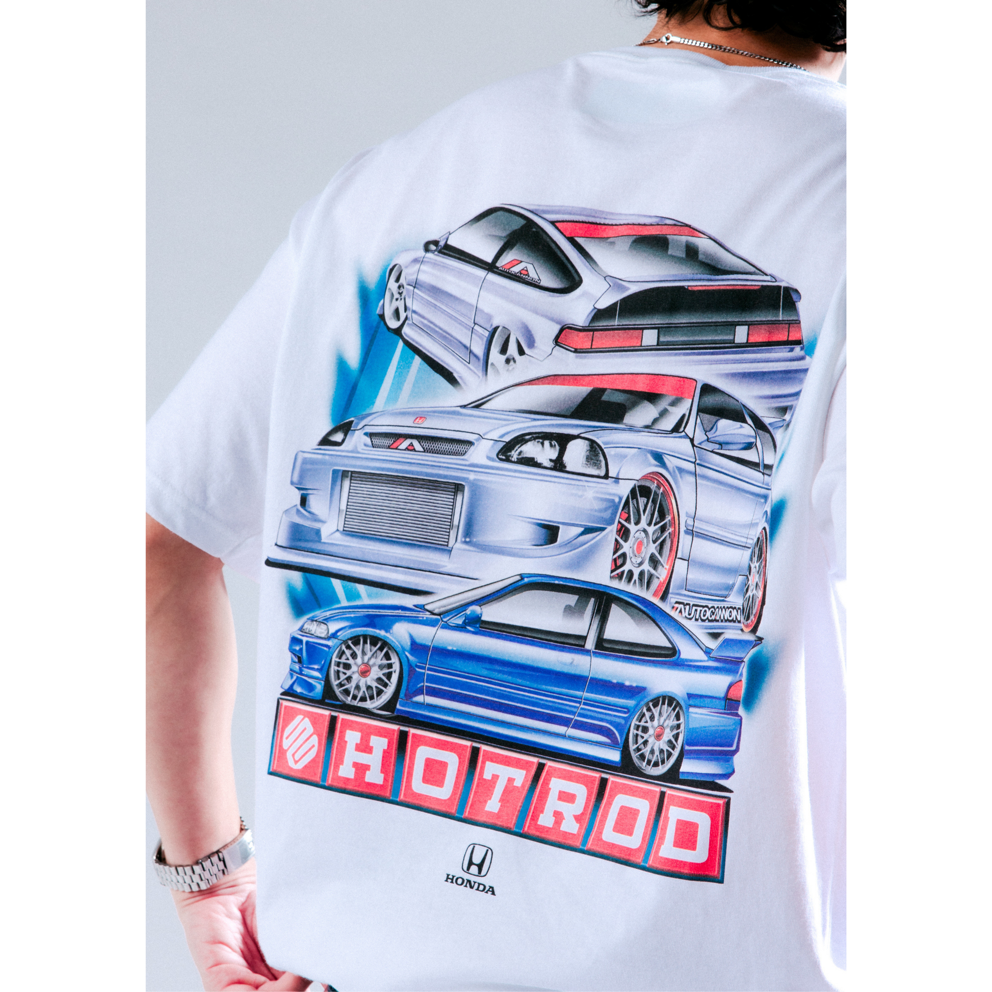 The Hotrod tee brings back one of the most recognized designs from the SGR archives. Featuring a trio of Hondas stacked in bold, high-impact illustration, this graphic defined the energy of late 90s and early 2000s tuner culture. The Hotrod logo anchors the artwork, paying homage to the original release that became a staple for enthusiasts worldwide.